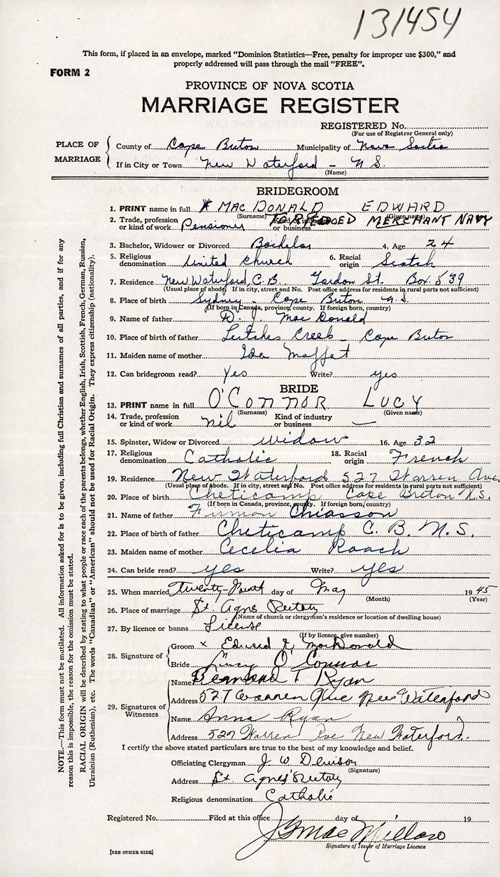 PLACE OF MARRIAGE County of Cape Breton in City or Town New Waterford