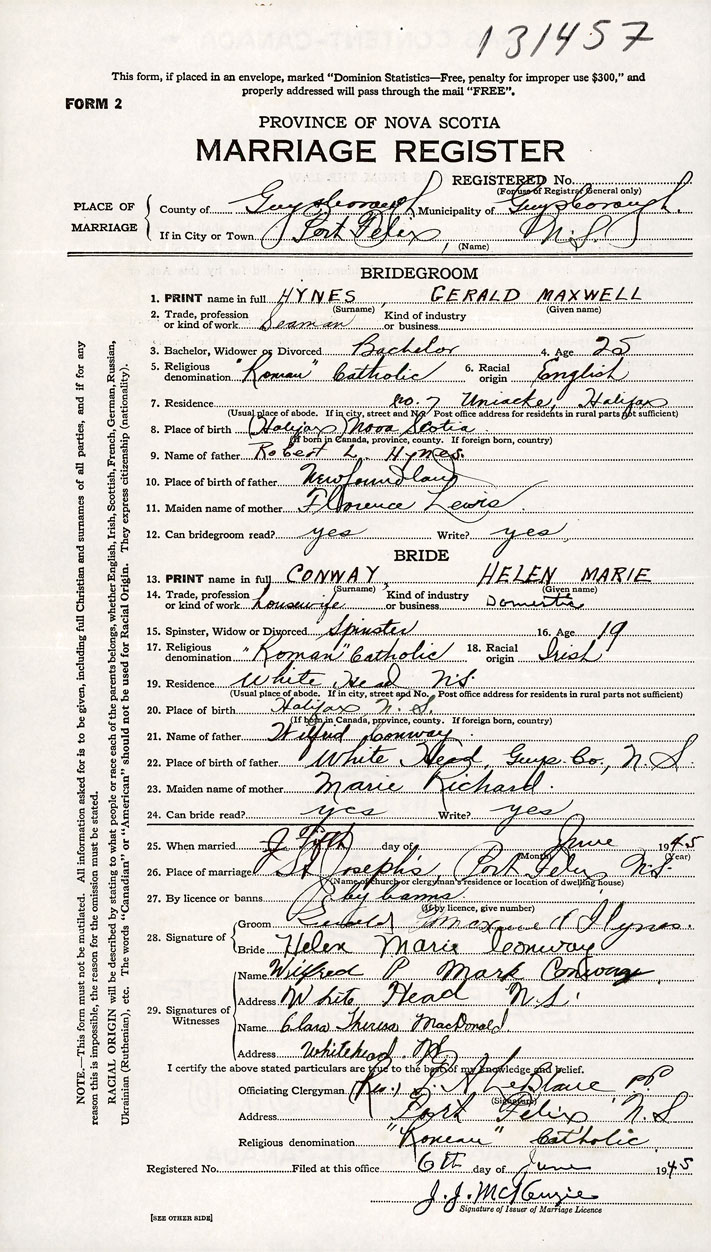 PLACE OF MARRIAGE County of Guysborough in City or Town Port Felix