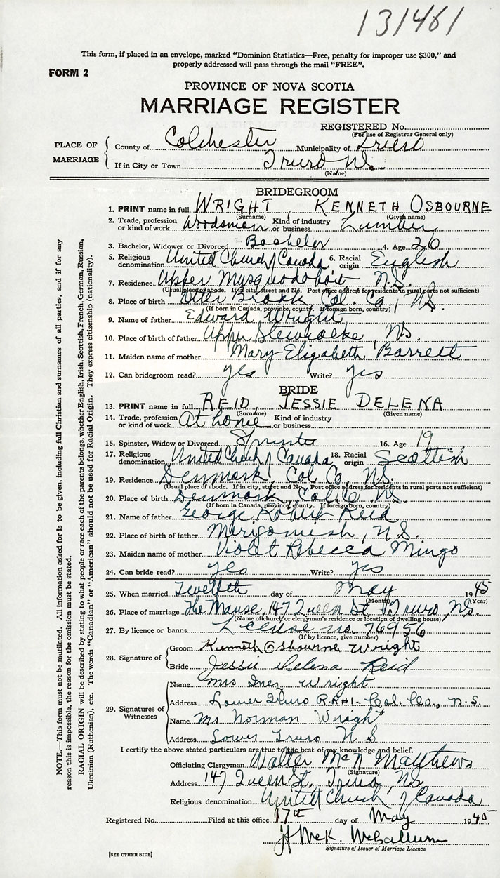 26. Place of marriage 147 Queen Street Truro, Colchester County