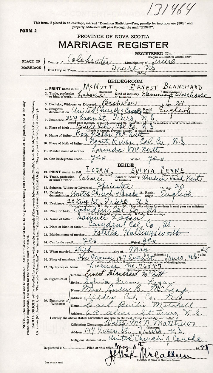 26. Place of marriage 147 Queen Street Truro, Colchester County