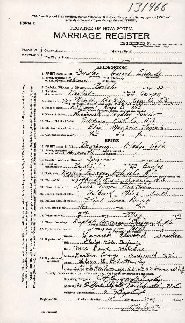 1. PRINT name in full Sawler, Garnet Elwood