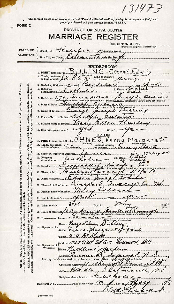 PLACE OF MARRIAGE County of Halifax in City or Town Eastern Passage