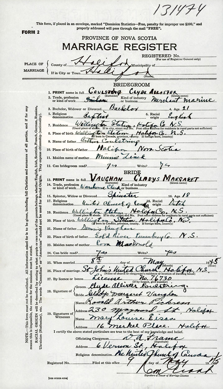 26. Place of marriage St John's United Church Halifax, Halifax County