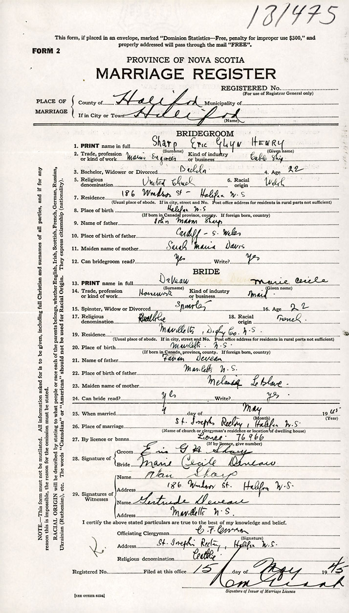 PLACE OF MARRIAGE County of Halifax in City or Town Halifax