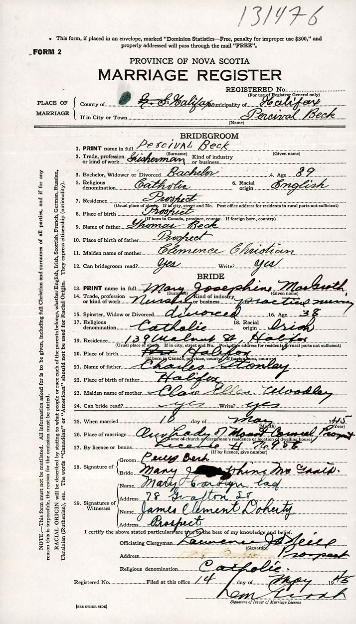 26. Place of marriage Our Lady of Mount Carmel Church Prospect, Halifax County