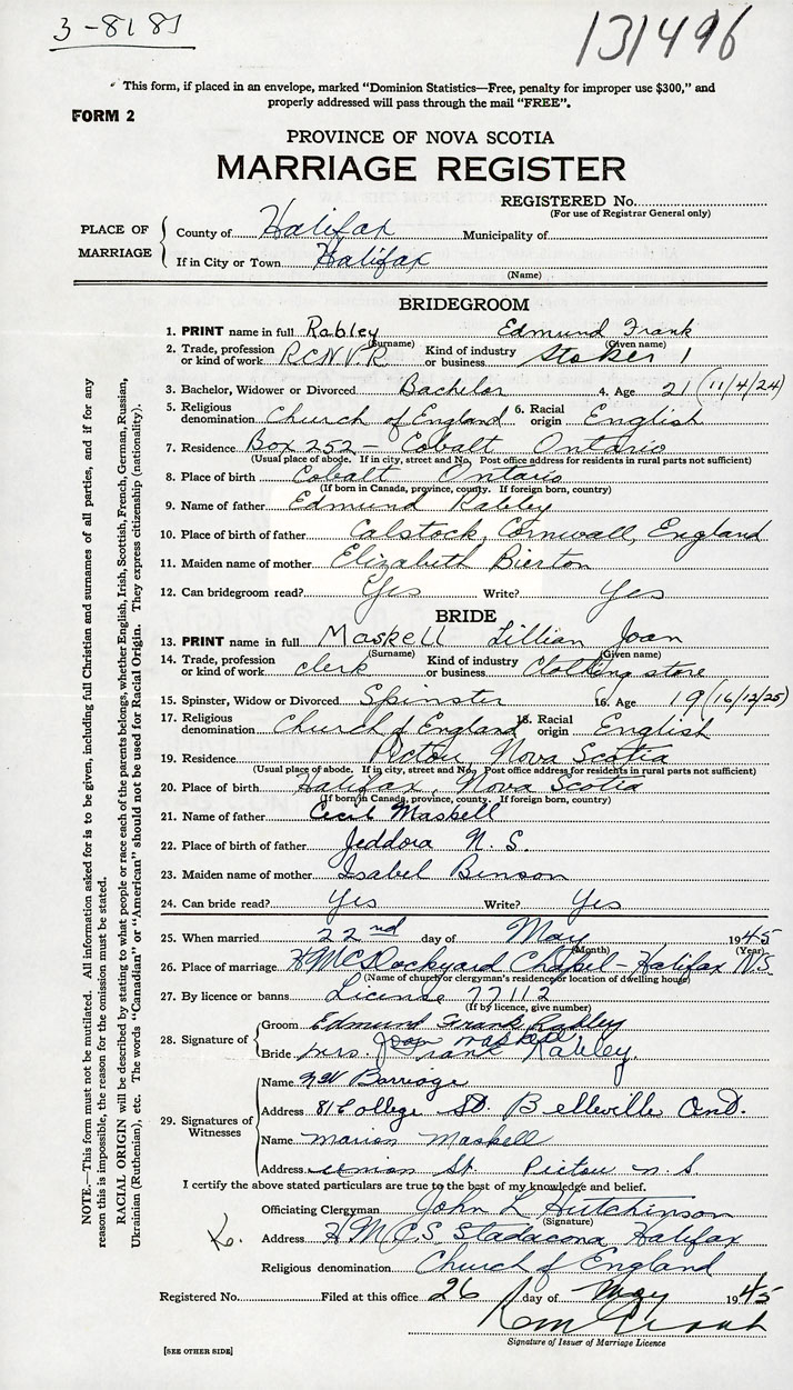 26. Place of marriage HMC Dockyard Chapel Halifax, Halifax County