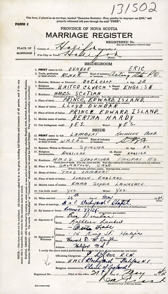 26. Place of marriage H.M.C. Dockyard Chapel Halifax, Halifax County