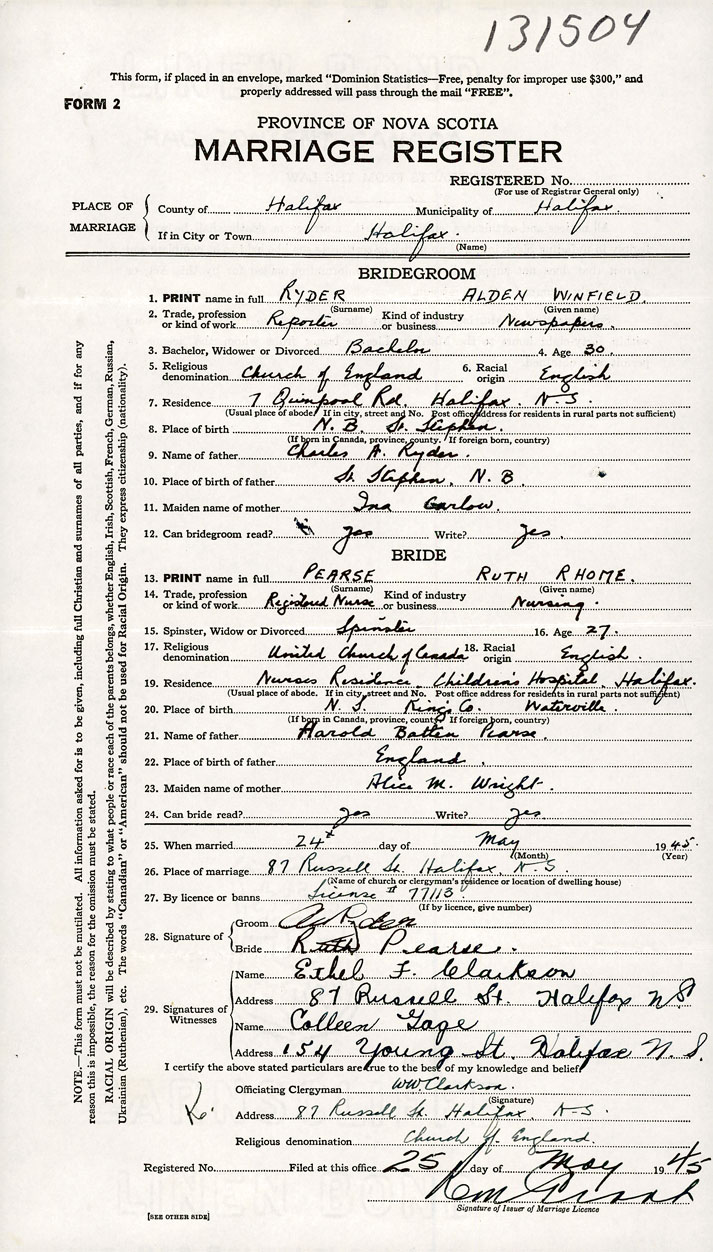 26. Place of marriage 87 Russell Street Halifax, Halifax County