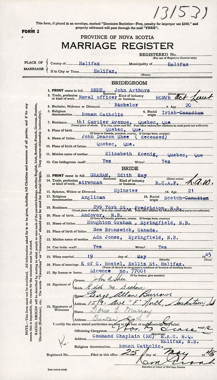 26. Place of marriage Knights of Columbus Hostel Hollis Street, Halifax County