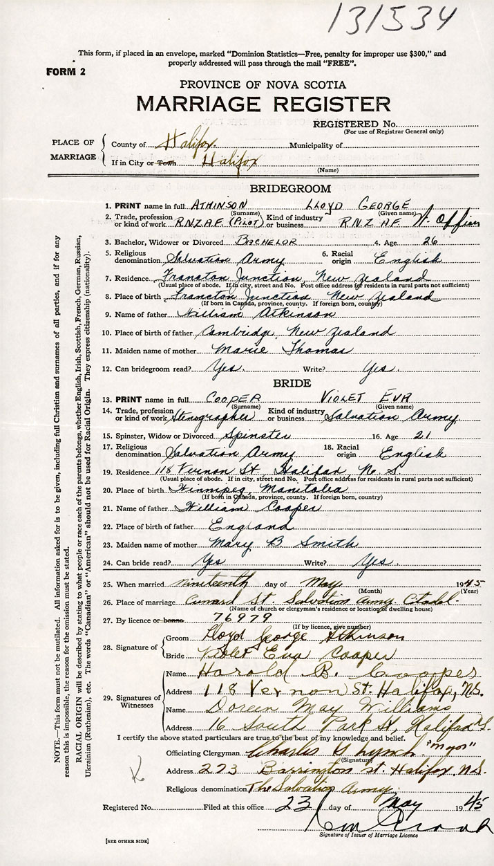 26. Place of marriage Cunard St., Salvation Army Citadel Halifax, Halifax County