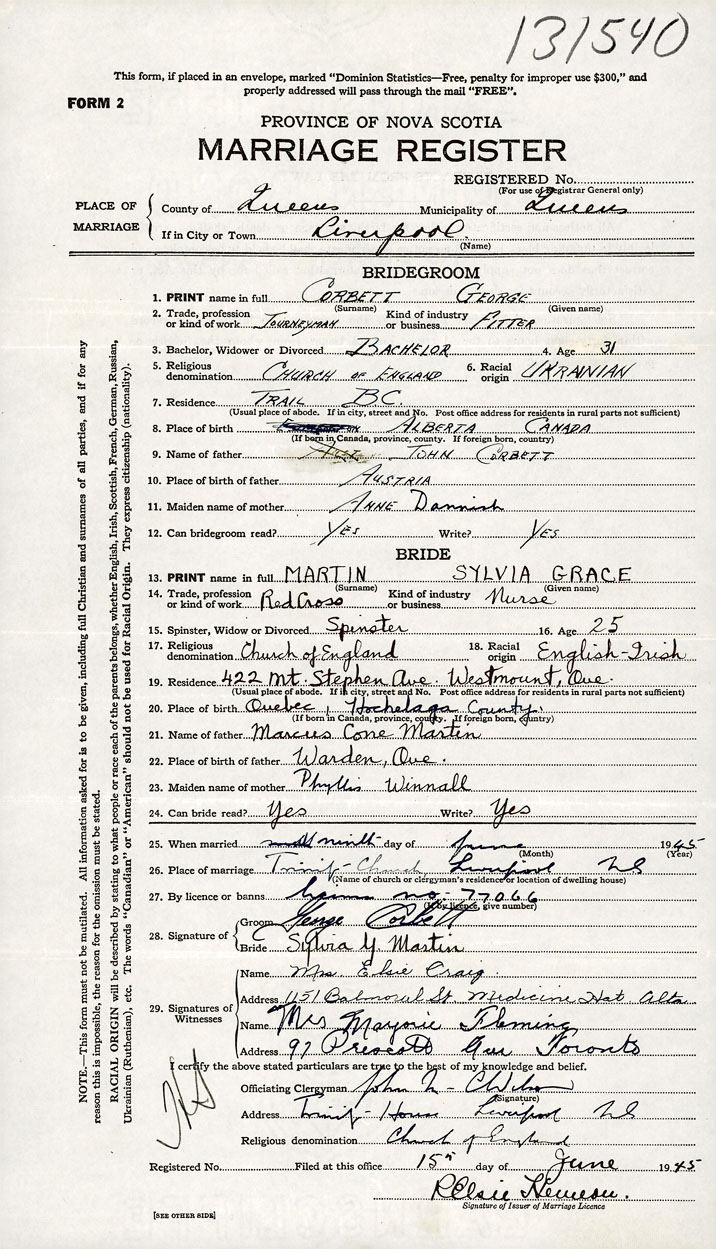 5. Religious denomination Anglican, Church of England 6. Racial origin Ukrainian