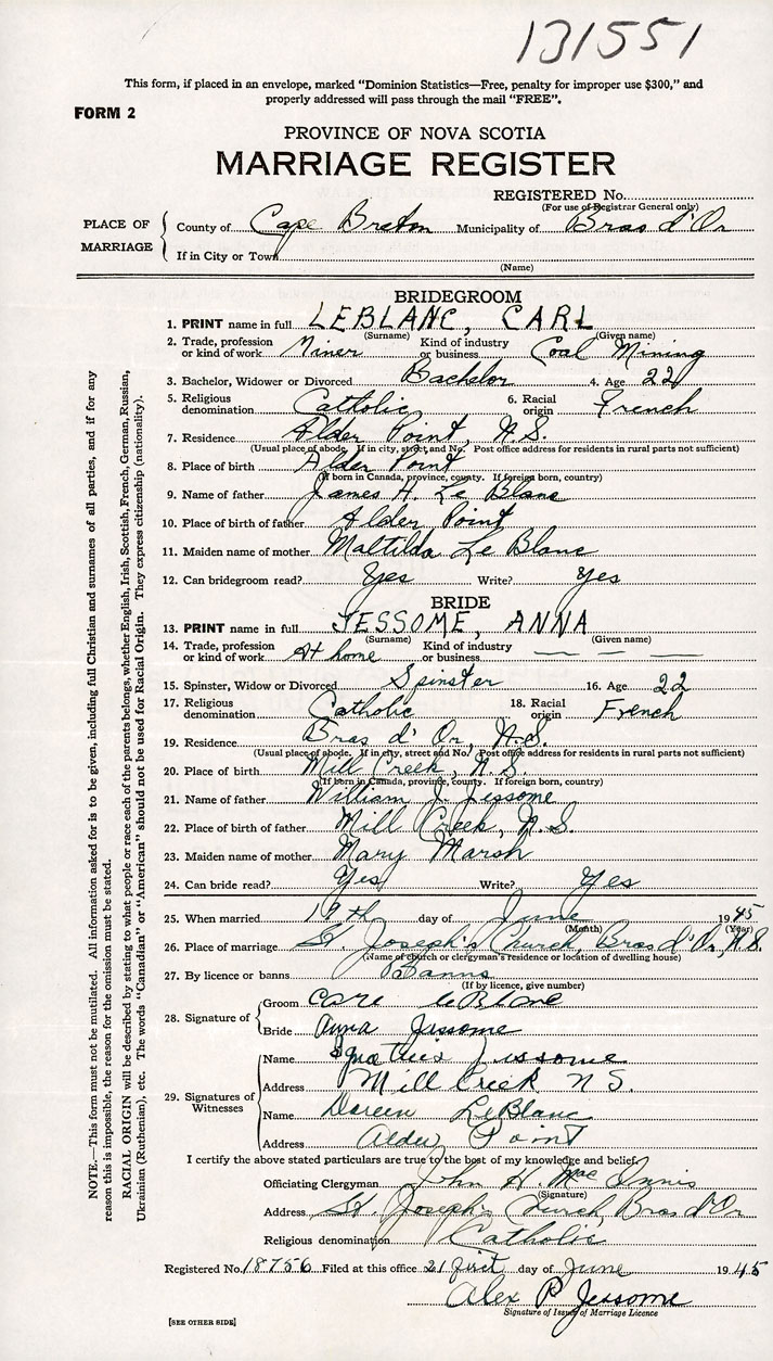 PLACE OF MARRIAGE County of Cape Breton in City or Town Bras d'Or