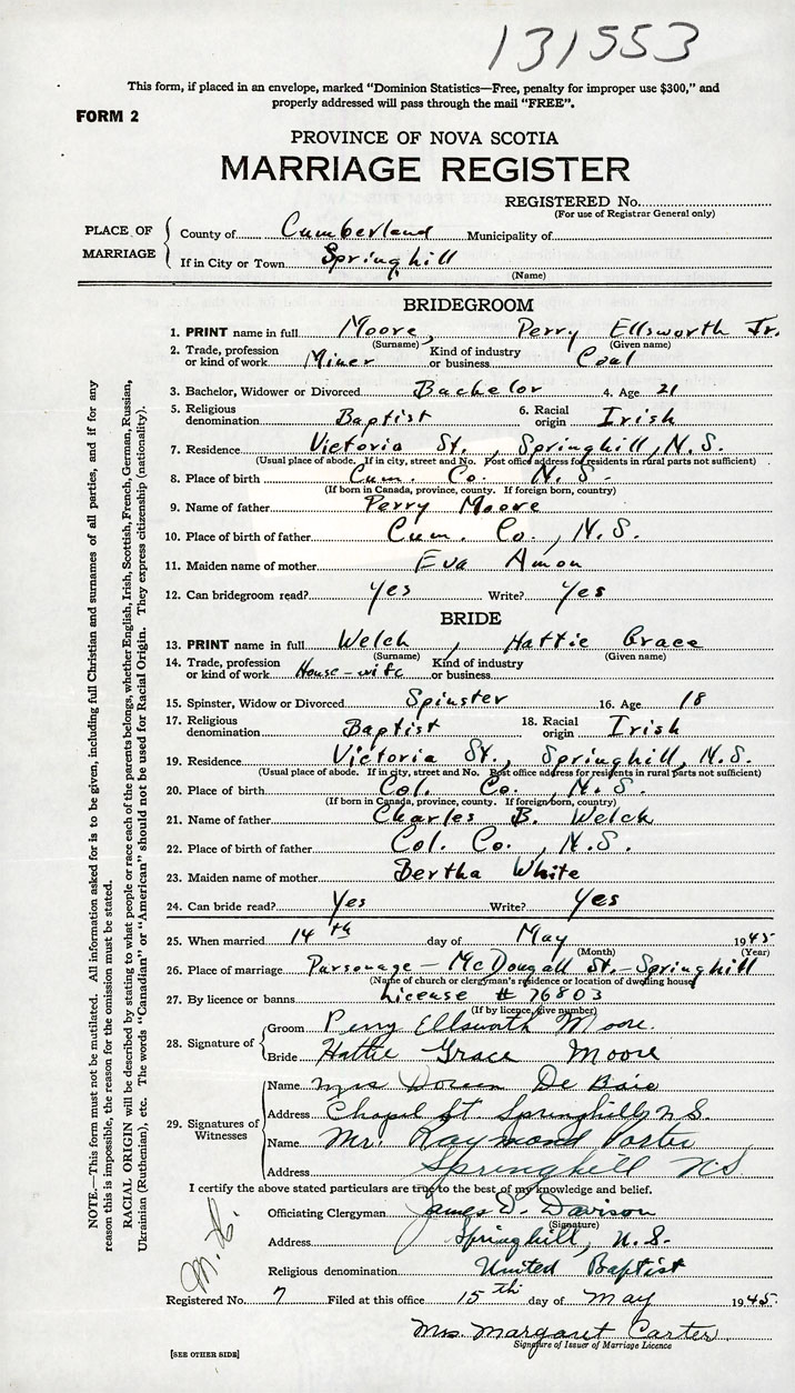 PLACE OF MARRIAGE County of Cumberland in City or Town Springhill