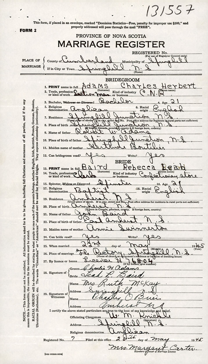 According to a certified copy of the Decree Absolute for Divorce dated 1958-10-10 and filed in the Office of the Registrar General under Divorce number 1864, it is ordered that the marriage of Charles Herbert Adams and Rebecca Leah Baird (Registered under marriage number 1945-131557) be null and void.