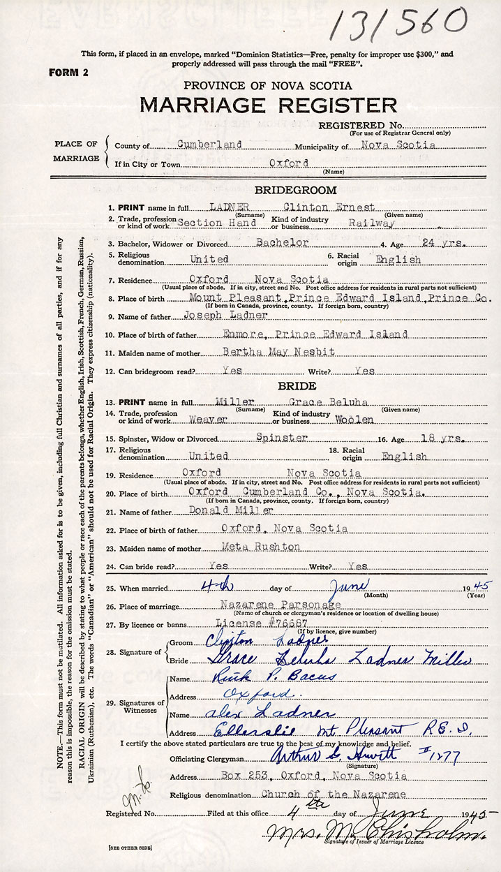 26. Place of marriage Nazarene Parsonage Oxford, Cumberland County