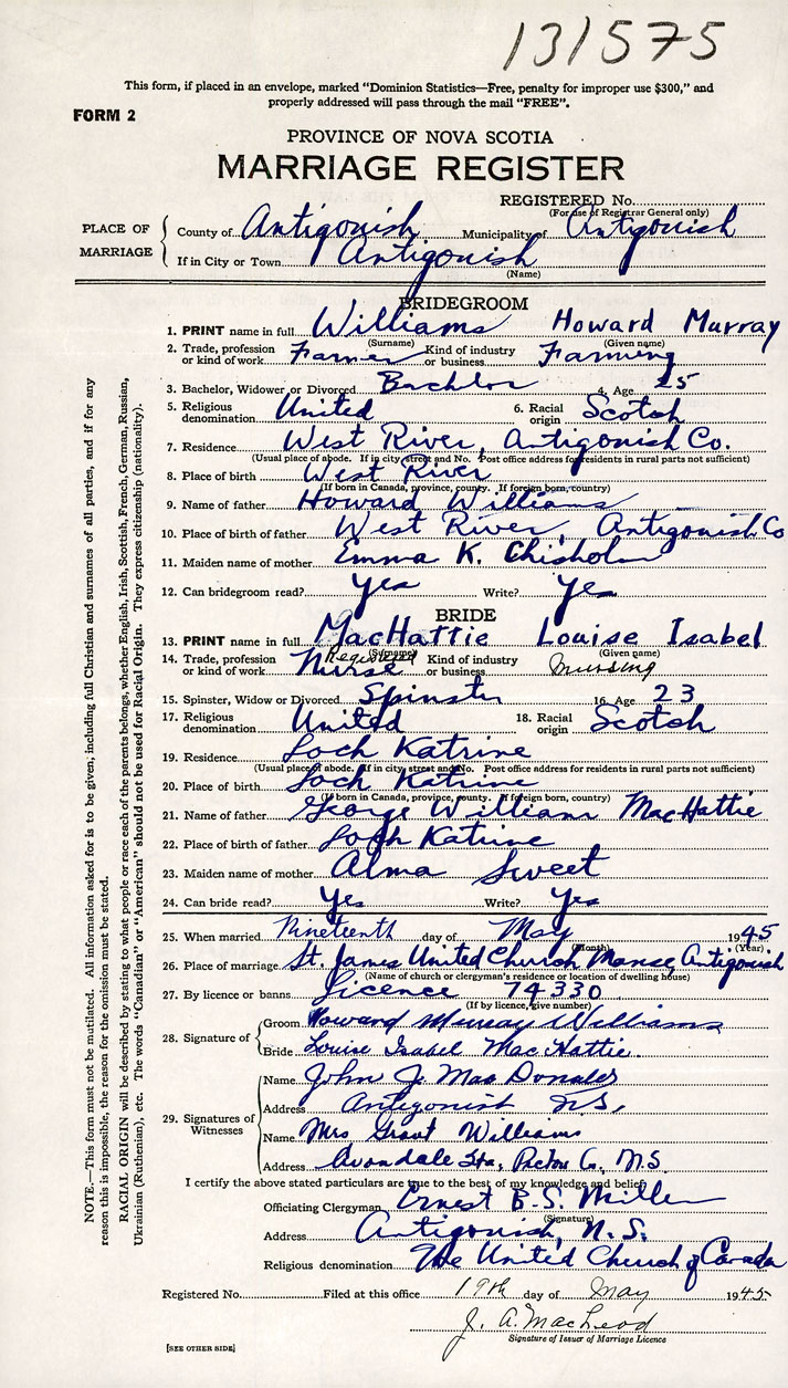 26. Place of marriage St. James United Church Antigonish , Antigonish County