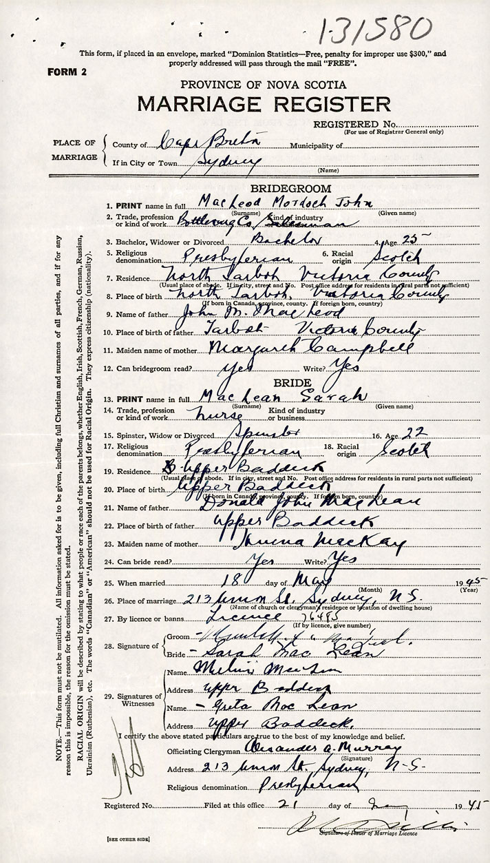 26. Place of marriage 213 Union St. Sydney, Cape Breton County