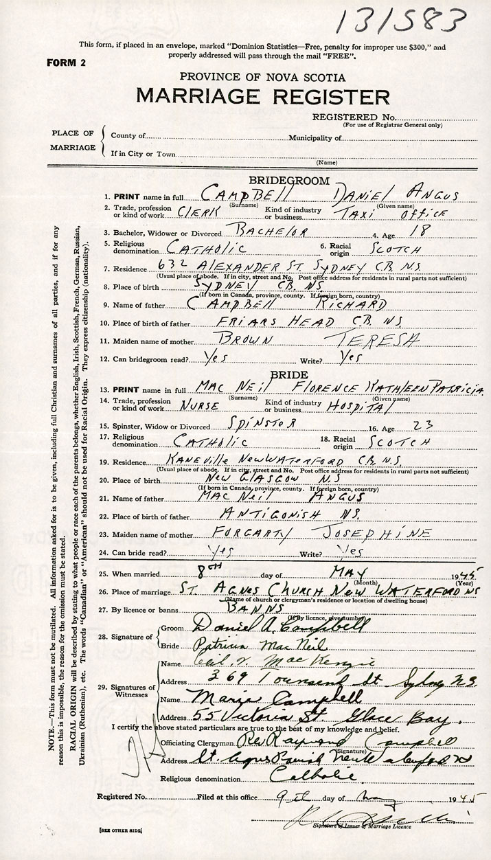 PLACE OF MARRIAGE County of Cape Breton in City or Town New Waterford