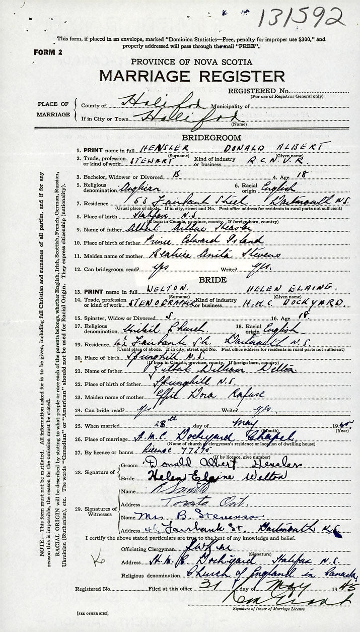 26. Place of marriage HMC Dockyard Chapel Halifax, Halifax County