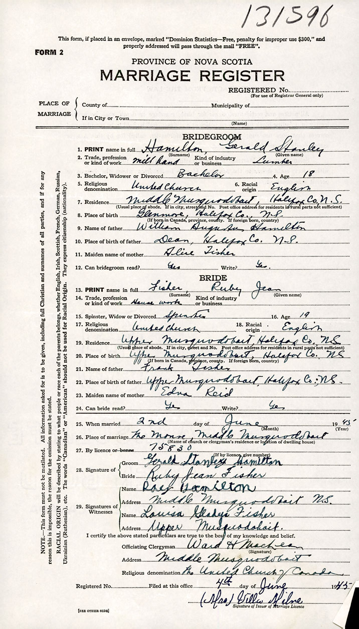 PLACE OF MARRIAGE County of Halifax in City or Town Middle Musquodoboit