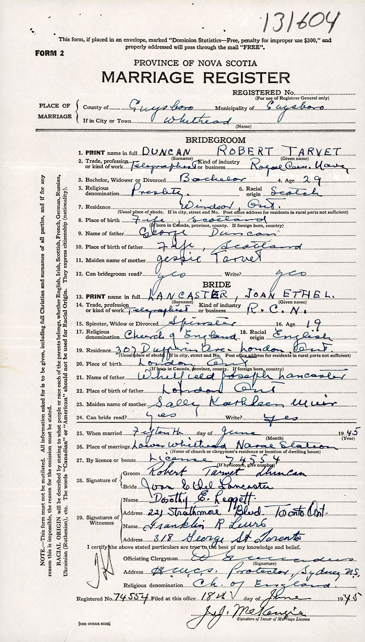 26. Place of marriage Naval Station Lower Whitehead, Guysborough County