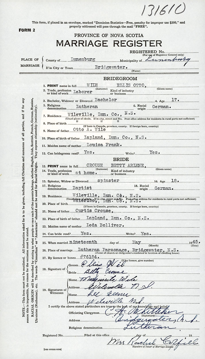 20. Place of birth Wileville, Lunenburg County, Nova Scotia