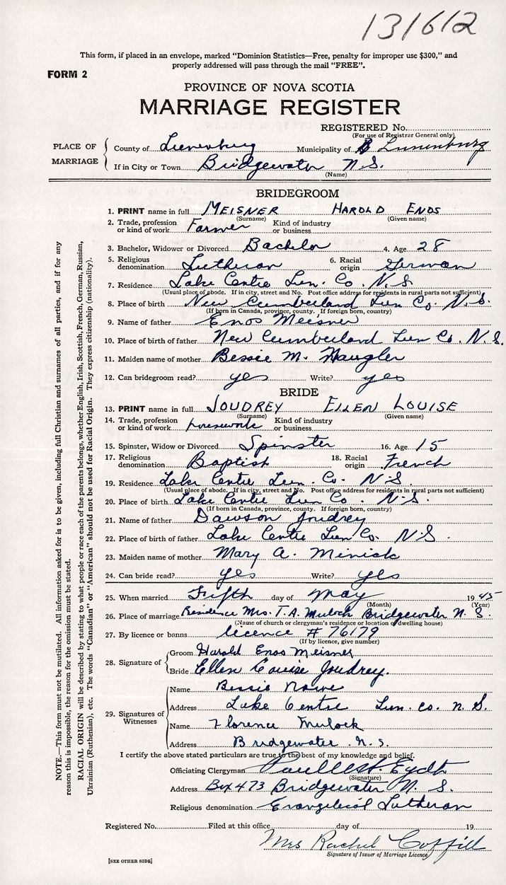 PLACE OF MARRIAGE County of Lunenburg in City or Town Bridgewater