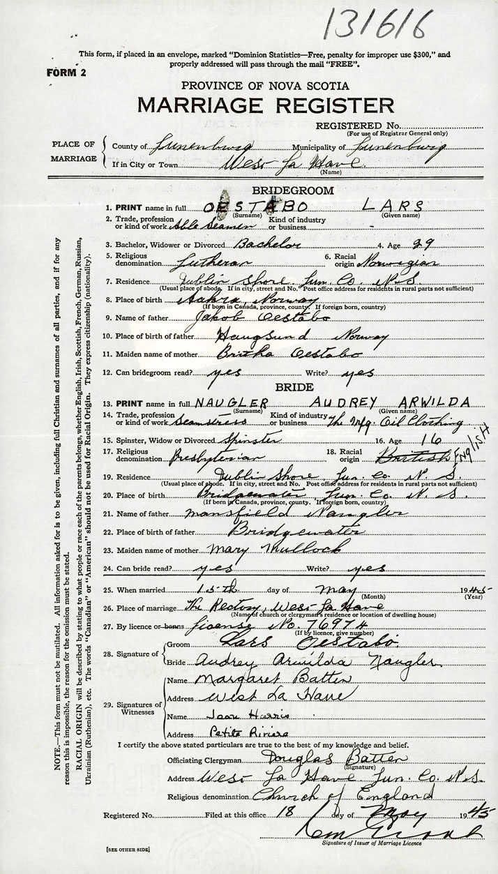 PLACE OF MARRIAGE County of Lunenburg in City or Town West LaHave