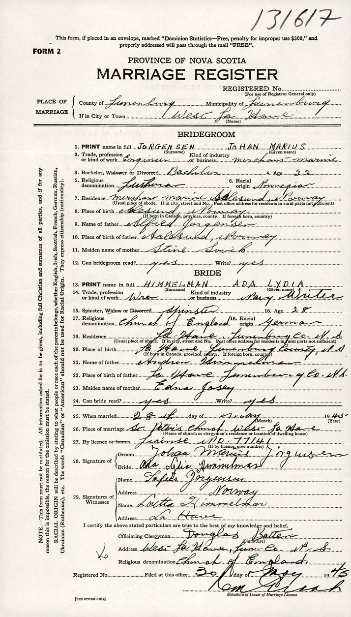 PLACE OF MARRIAGE County of Lunenburg in City or Town West LaHave