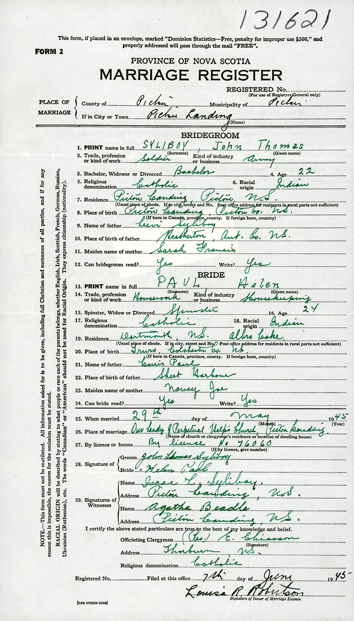 26. Place of marriage Our Lady of Perpetual Help Church Pictou Landing, Pictou County