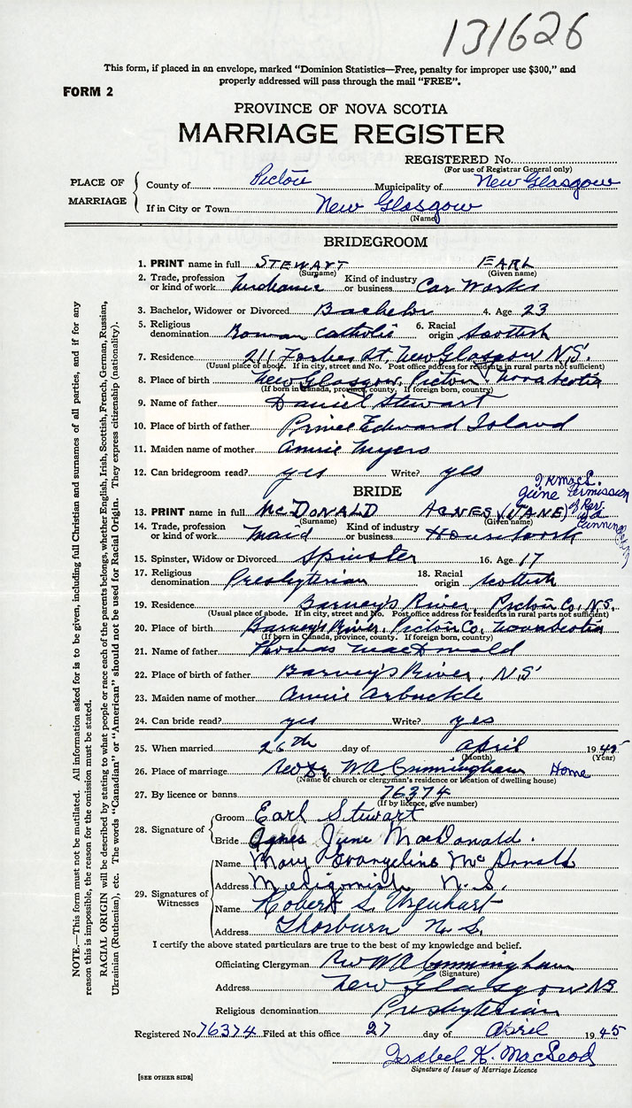 26. Place of marriage Rev Fr, W.A. Cunningham Home New Glasgow, Pictou County