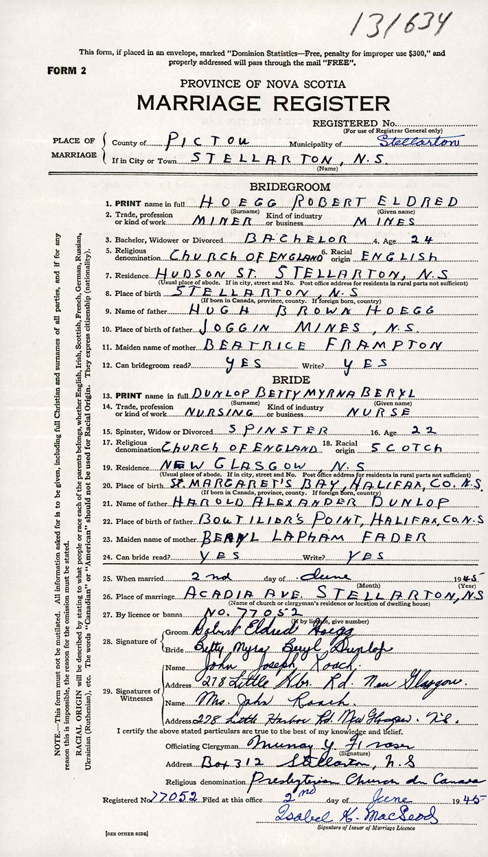 26. Place of marriage Acadia Avenue Stellarton, Pictou County