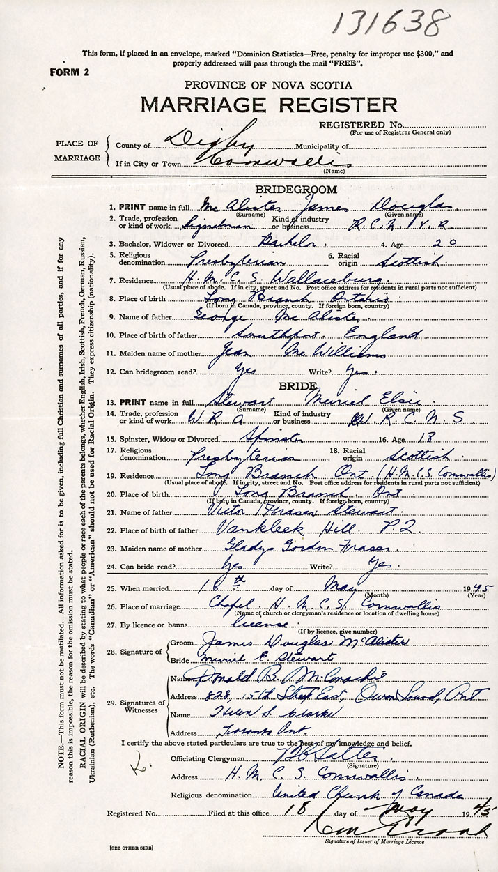 26. Place of marriage Chapel HMCS Cornwall Cornwallis, Digby County