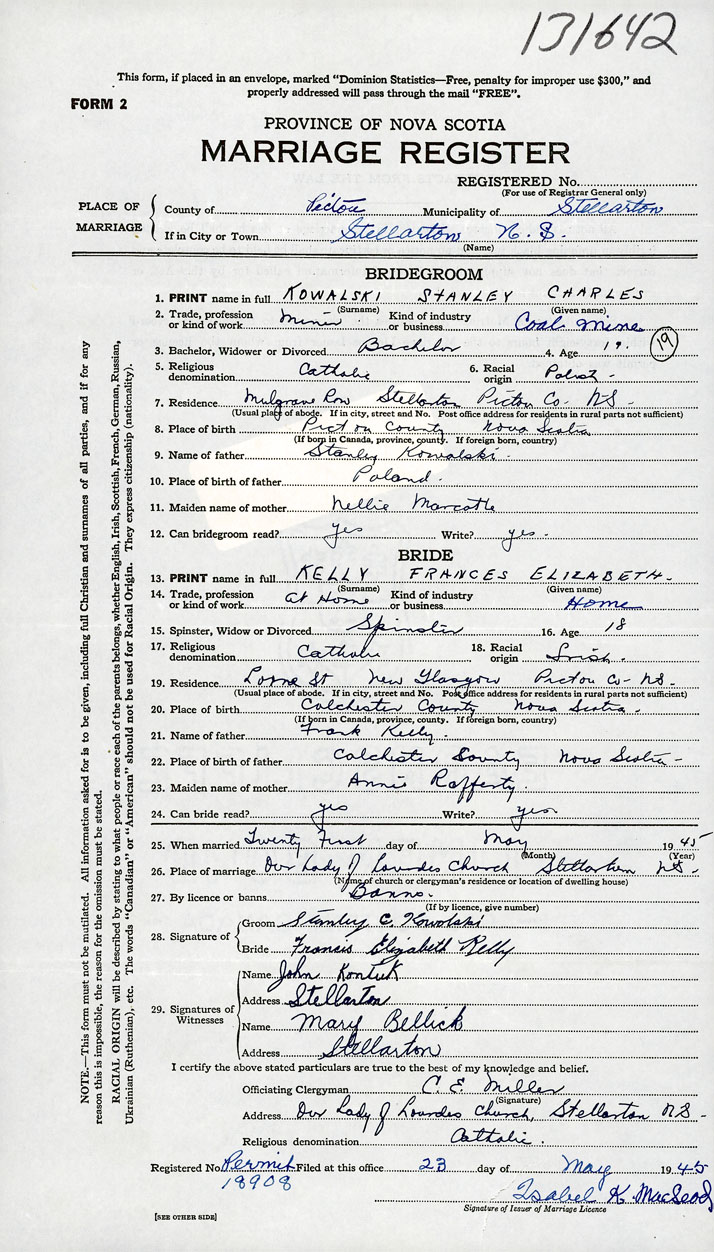 26. Place of marriage Our Lady of Lourdes Church Stellarton, Pictou County