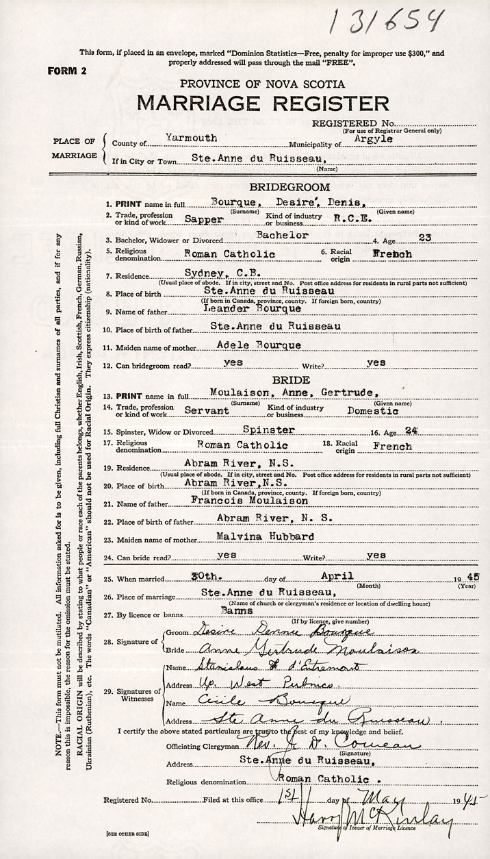 26. Place of marriage Ste. Anne du Ruisseau, Yarmouth County