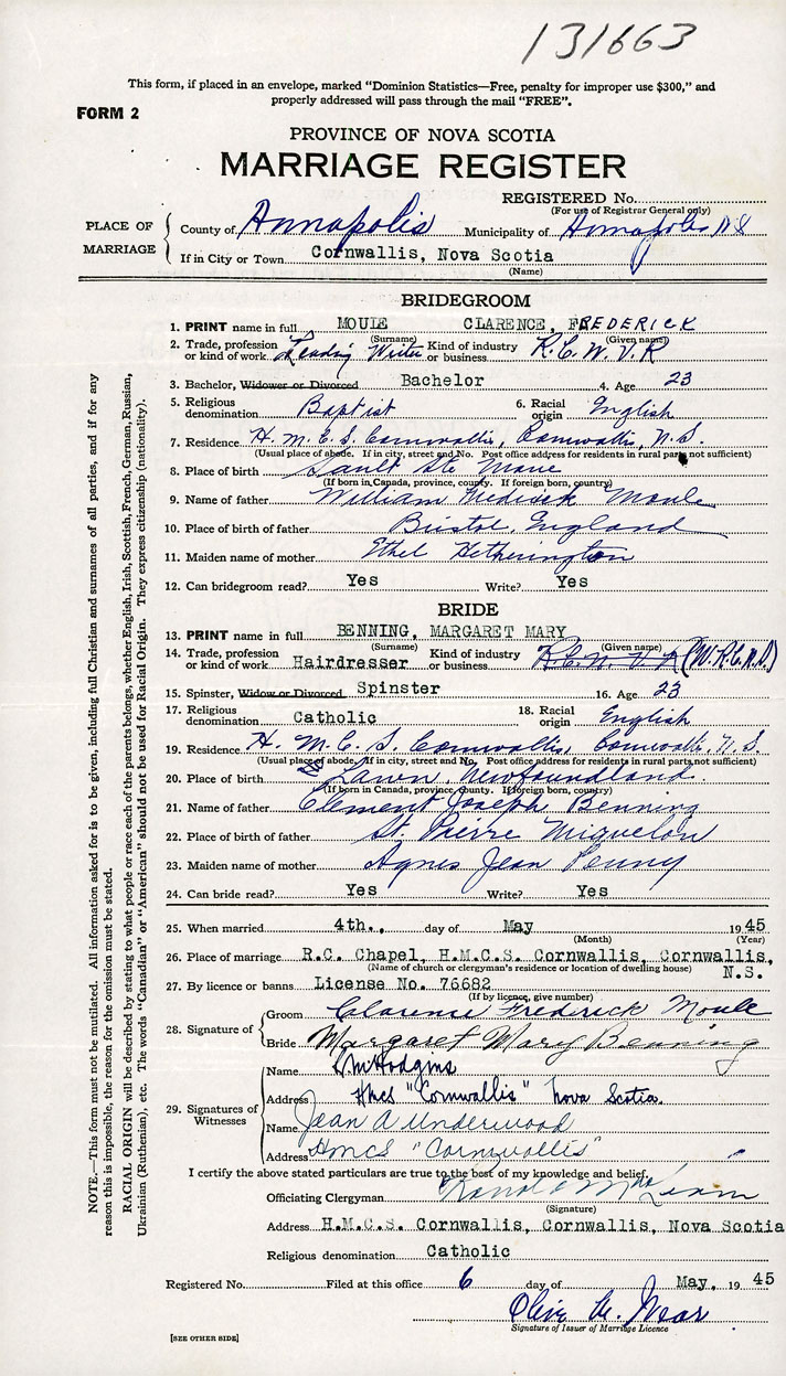 26. Place of marriage R C Chapel, HMCS Cornwallis Cornwallis, Annapolis County