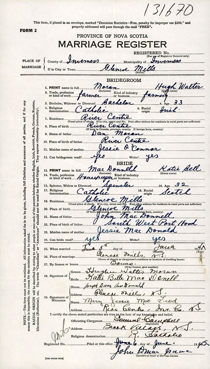 PLACE OF MARRIAGE County of Inverness in City or Town Glencoe Mills