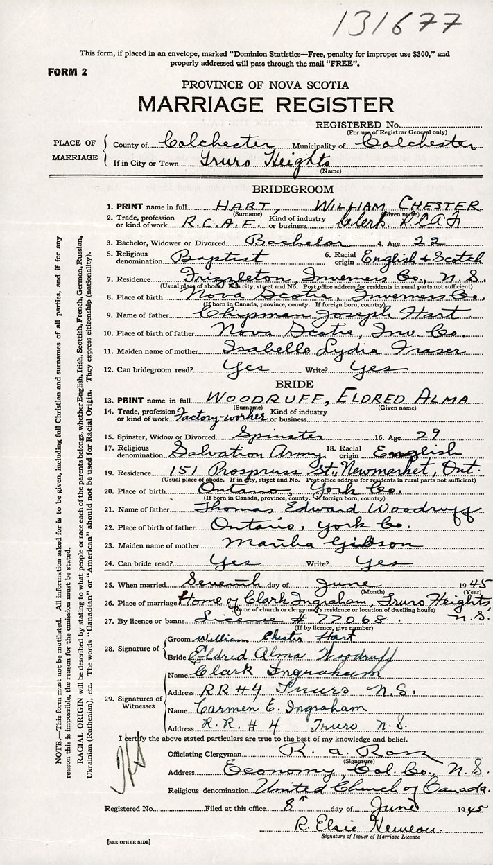 26. Place of marriage Home of Clark Ingraham Truro Heights, Colchester County