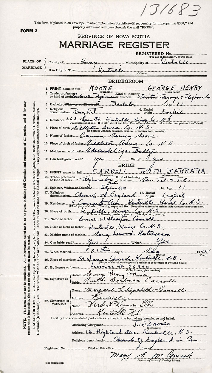 26. Place of marriage St James Church Kentville, Kings County