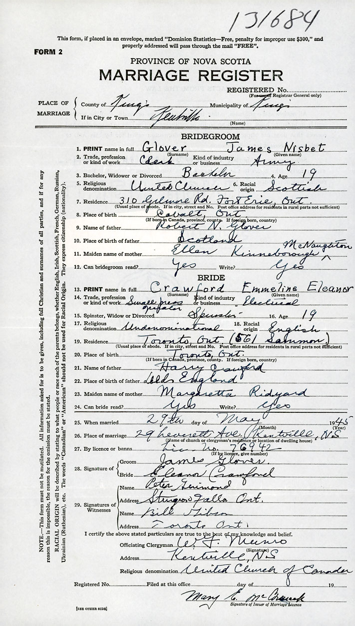 26. Place of marriage 29 Leverett, Avenue Kentville, Kings County