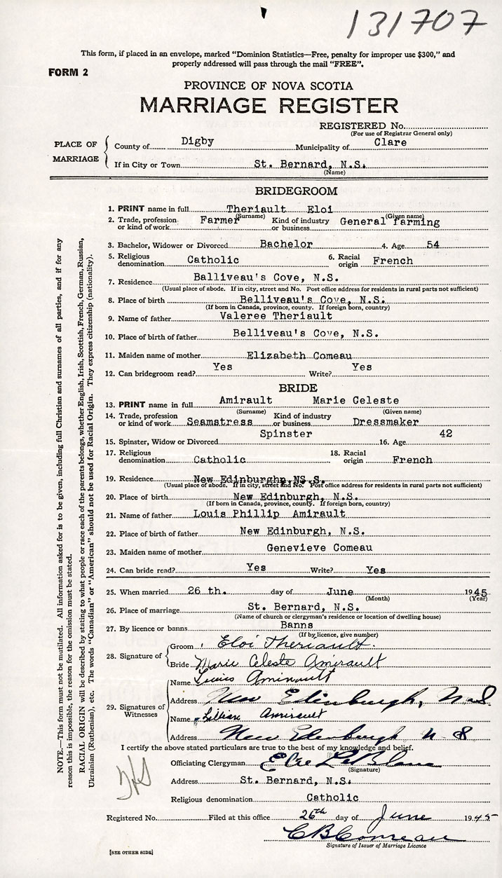 26. Place of marriage St. Bernard, Digby County