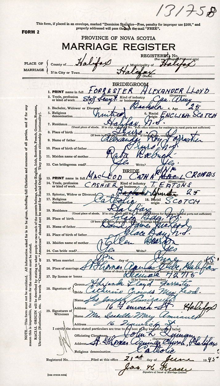 26. Place of marriage St. Thomas Aquina Glebe Glacé Bay , Halifax County