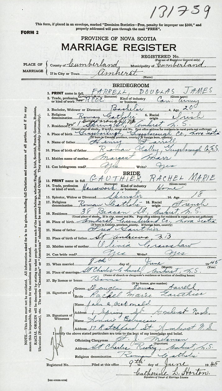 26. Place of marriage St. Charles Church Amherst, Cumberland County
