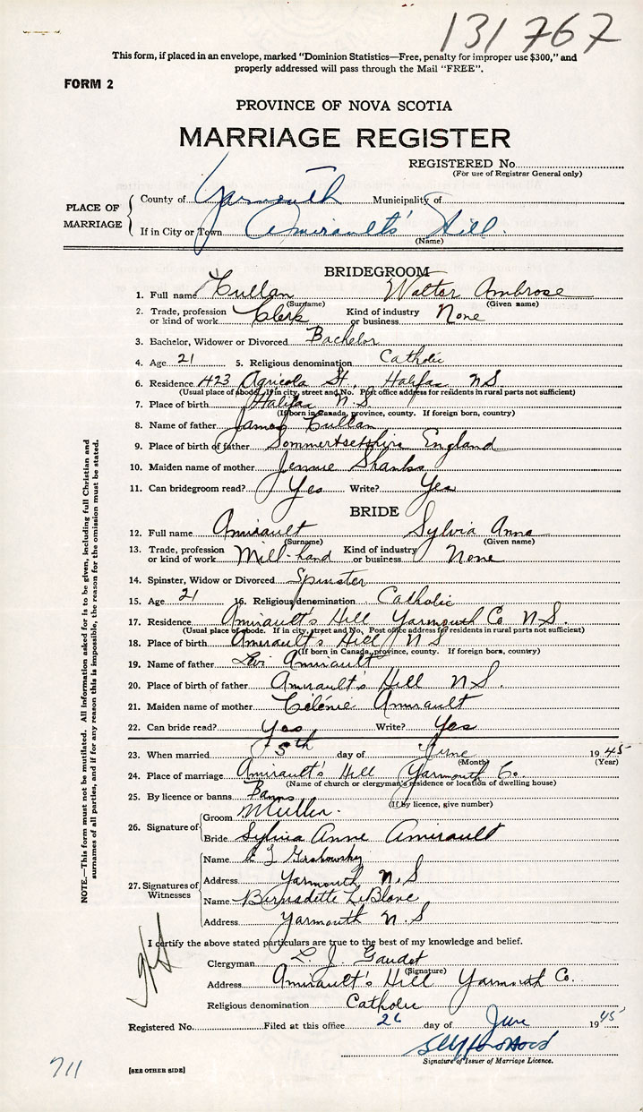 PLACE OF MARRIAGE County of Yarmouth in City or Town Amirault's Hill