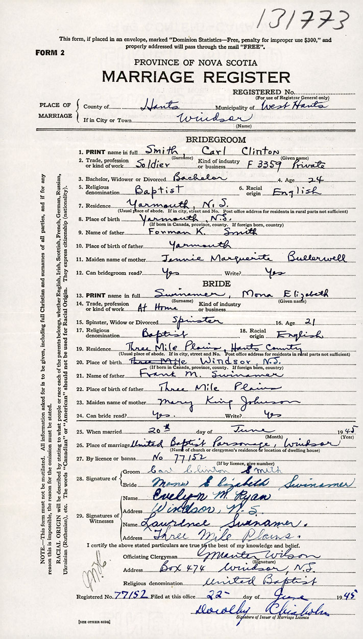PLACE OF MARRIAGE County of Hants in City or Town Windsor