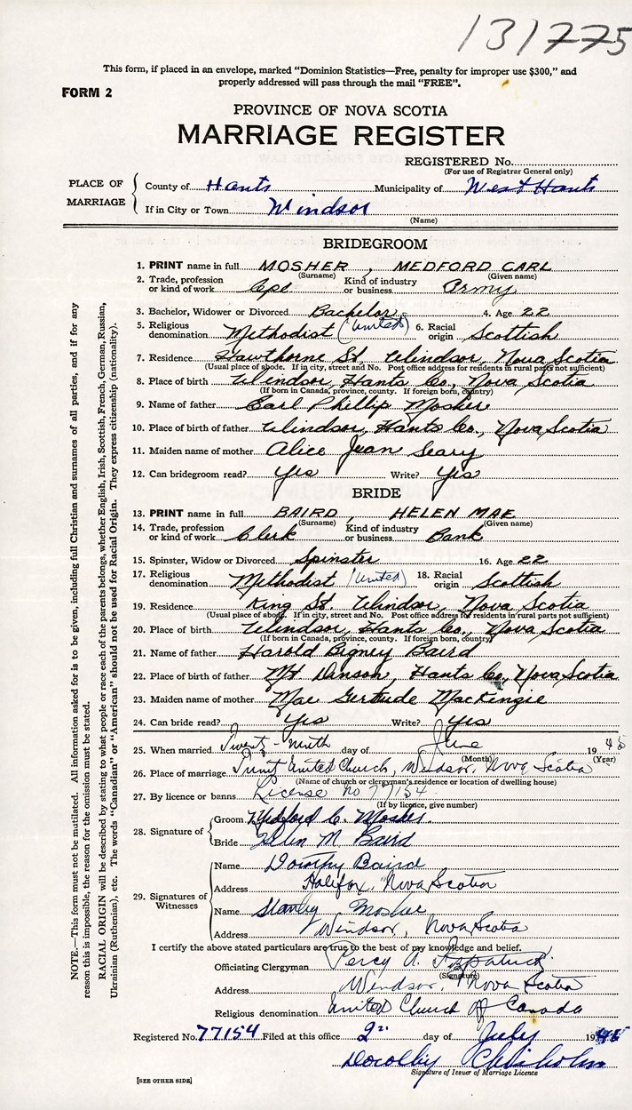 26. Place of marriage Trinity United Church Windsor, Hants County