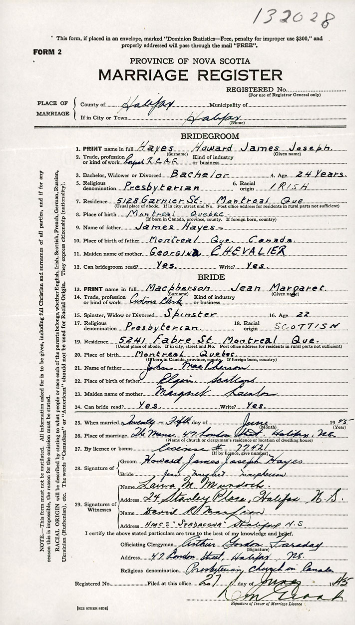 PLACE OF MARRIAGE County of Halifax in City or Town Halifax