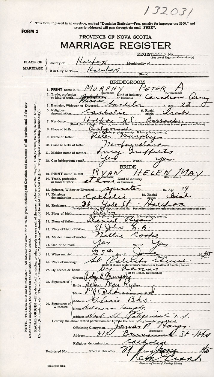 26. Place of marriage Saint Patrick's Church Halifax, Halifax County