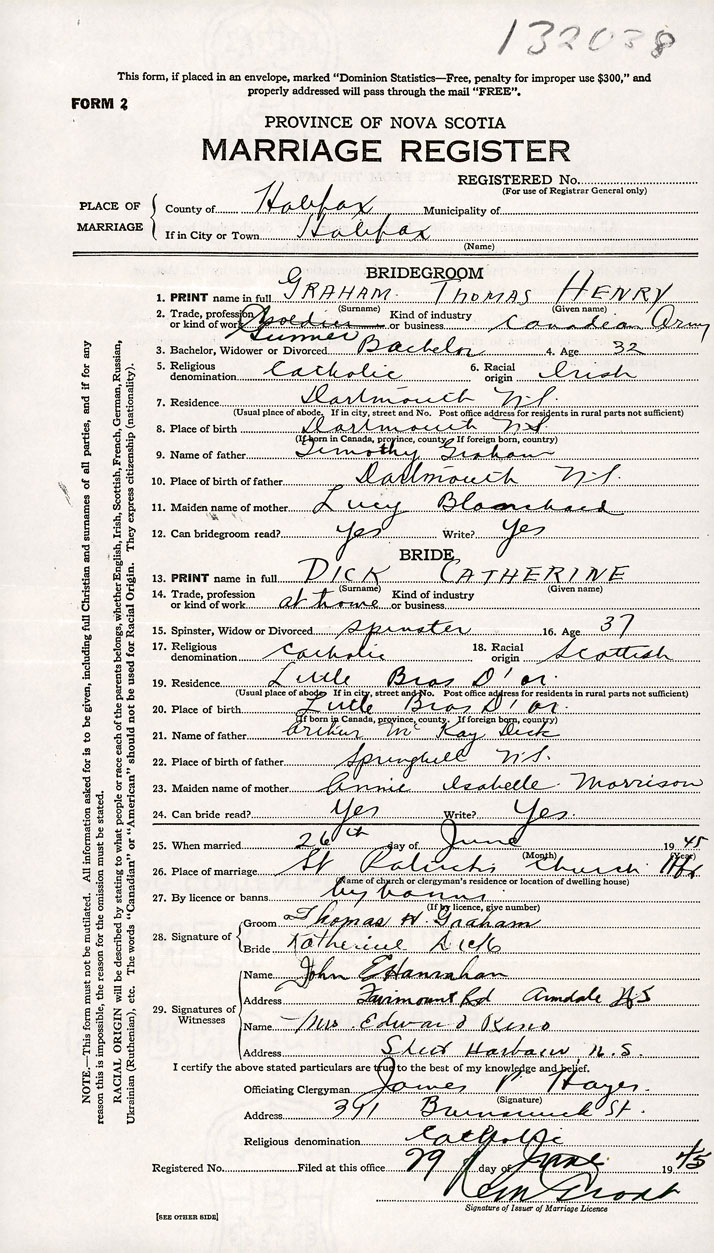 26. Place of marriage St. Patrick's Church Halifax, Halifax County