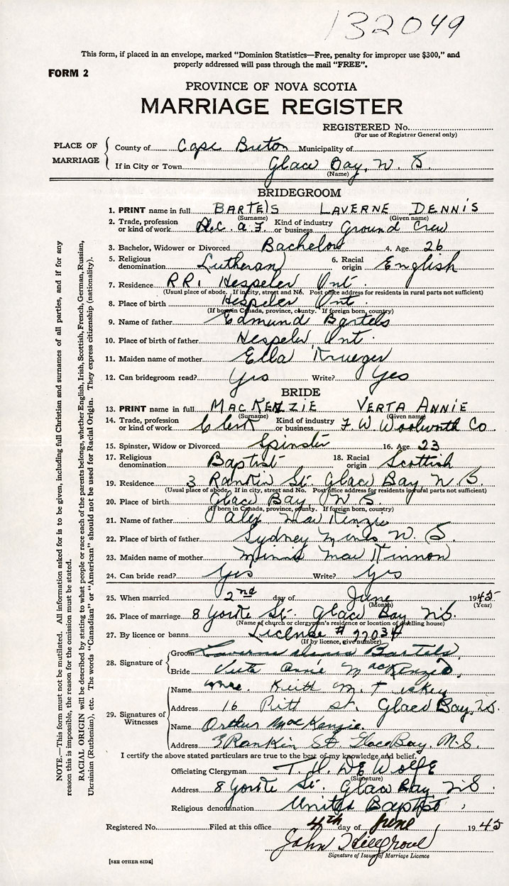 26. Place of marriage 8 Yorke St. Glace Bay, Cape Breton County